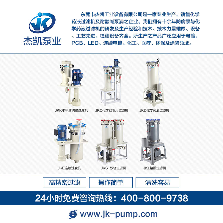 杰凱JKC化學(xué)藥液過濾機主體采用PP材料注射成型使用范圍廣,被廣泛應(yīng)用于電鍍、表面處理、金屬精飾、PCB蝕刻