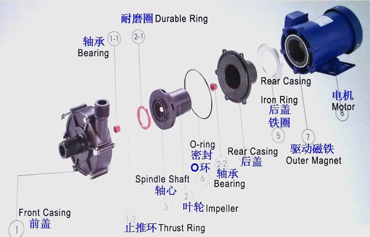 旋轉(zhuǎn),實(shí)現(xiàn)動力的無接觸傳遞。由於泵軸、內(nèi)磁轉(zhuǎn)子被泵體、隔離套完全封閉,動密封轉(zhuǎn)化為靜密
